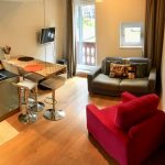 L’appartement refait à neuf se situe au 3ème étage et dispose d’un balcon. Surface : 25m² et 15m² de mezzanine. Avec deux chambres séparées à l’étage, lit double et lit simple. Salle de bains avec sèche serviettes et douche à l’italienne en marbre de Savoie. WC séparé. Cuisine ouverte sur le salon avec four (multi-fonctions), plaque d’induction, frigidaire, lave-vaisselle. Séjour avec jolie table en chêne suspendue et trois sièges hauts, canapé et fauteuil. TV écran plat, accès WiFi, radio.