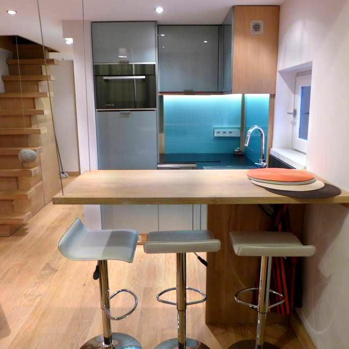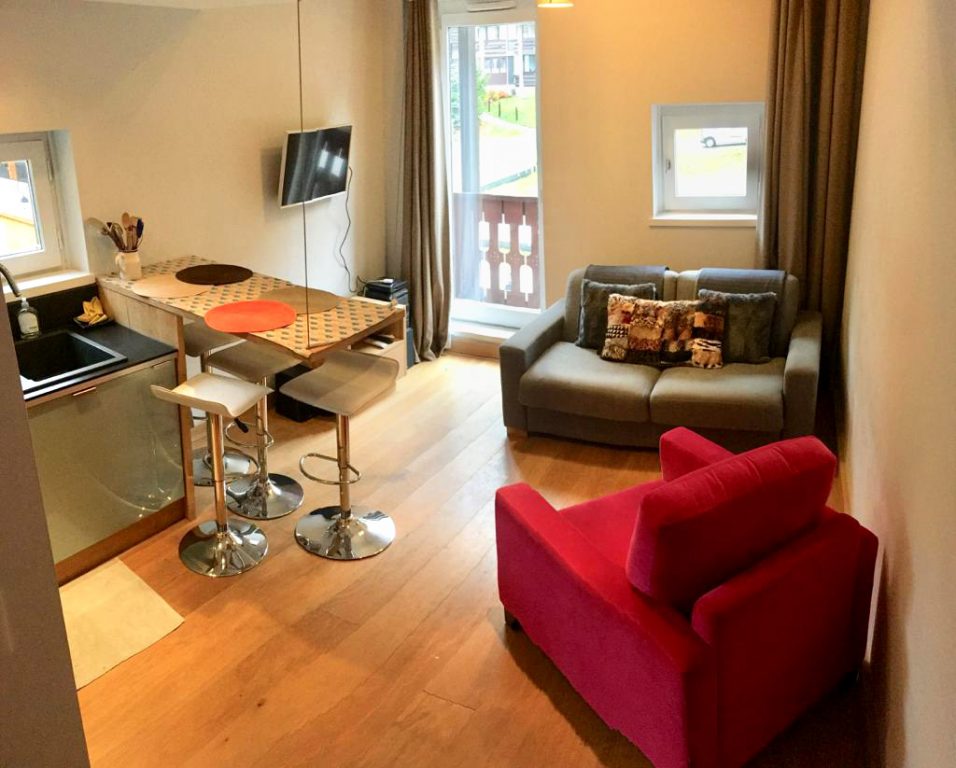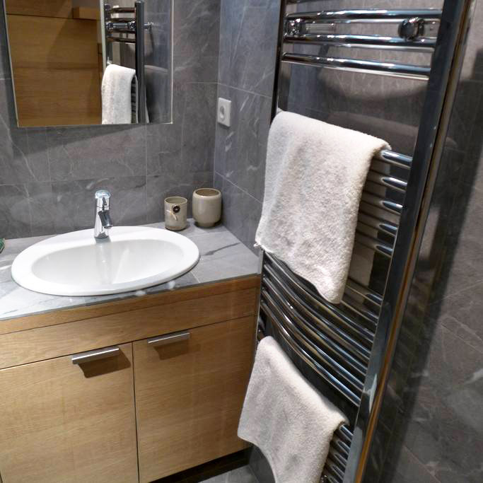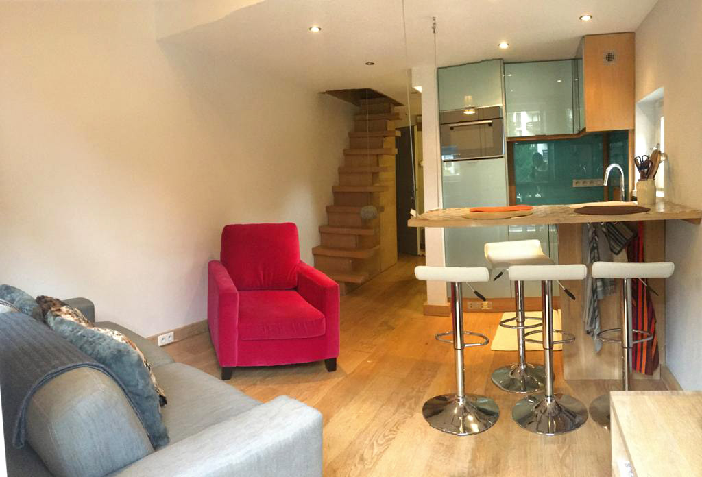 L’appartement refait à neuf se situe au 3ème étage et dispose d’un balcon. Surface : 25m² et 15m² de mezzanine. Avec deux chambres séparées à l’étage, lit double et lit simple. Salle de bains avec sèche serviettes et douche à l’italienne en marbre de Savoie. WC séparé. Cuisine ouverte sur le salon avec four (multi-fonctions), plaque d’induction, frigidaire, lave-vaisselle. Séjour avec jolie table en chêne suspendue et trois sièges hauts, canapé et fauteuil. TV écran plat, accès WiFi, radio.